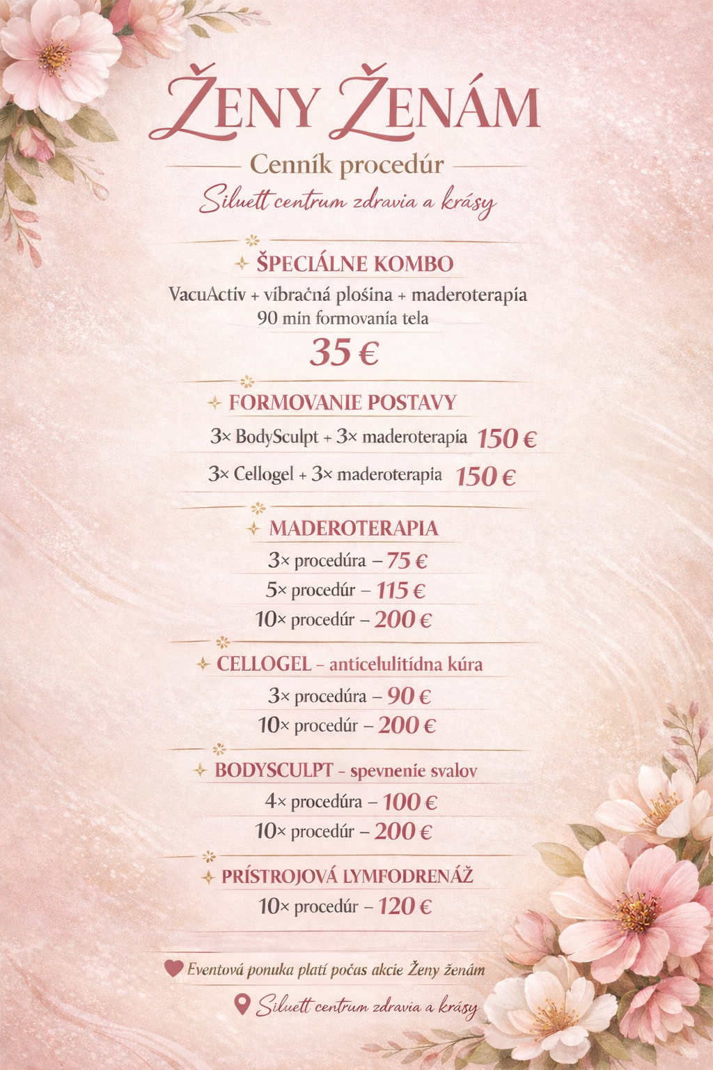Vitajte v SILUETTVK, mieste, kde sa staráme o vaše telo a krásu! Sme špecialisti na formovanie postavy, zostíhlovacie a anticelulitídne ošetrenia a ošetrenia tváre, ktoré vám pomôžu dosiahnuť želané výsledky a zlepšiť vaše sebavedomie.