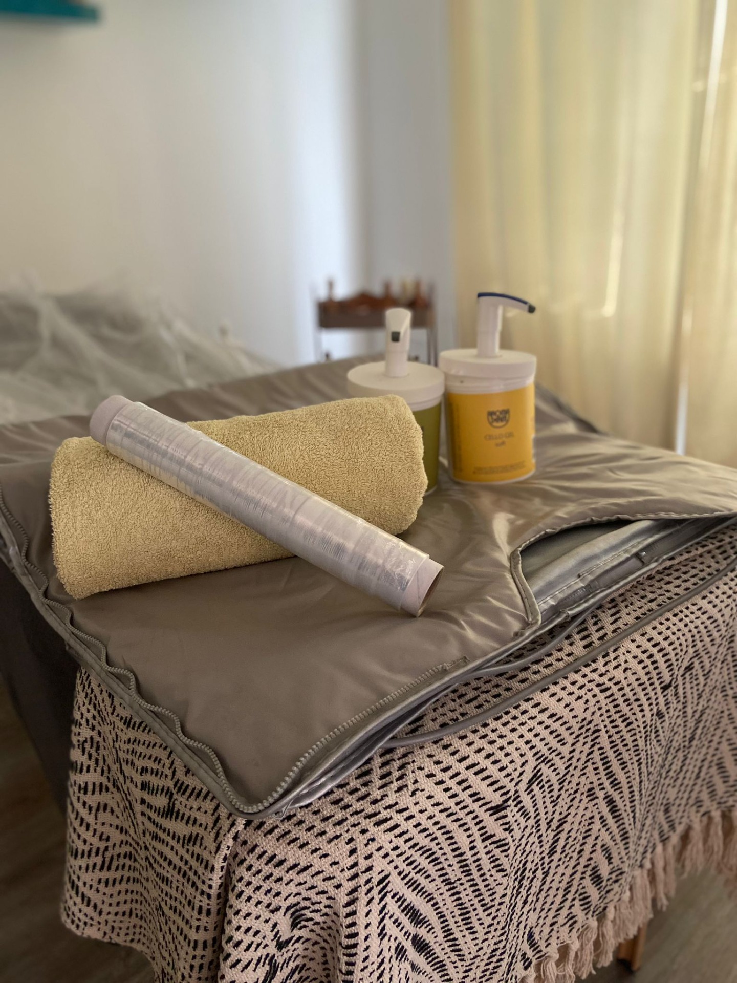 Body Wraping Cello Zoštíhľujúci zábal, ktorý redukuje celulitídu a detoxikuje telo. Aktívne gély CELLO obsahujúce 35 éterických olejov, ktoré podporujú formovanie postavy, spevnenie pokožky a detoxikáciu tela. Hlavnými zložkami sú škoricový olej na odbúravanie tukov, pomarančový olej na spaľovanie a mäta s rozmarínom na zlepšenie prekrvenia a aktiváciu lymfy. Vďaka aromaterapeutickým účinkom gély navodzujú pocit sýtosti, harmonizujú telo i myseľ a poskytujú dlhodobé výsledky.